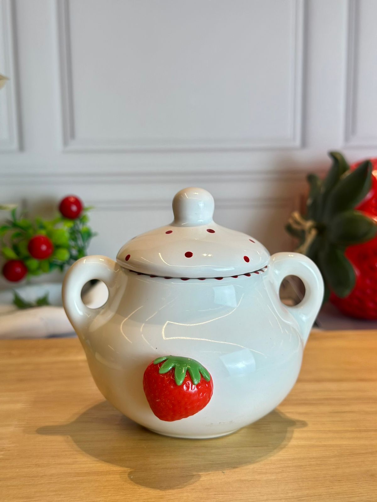 O açucareiro em cerâmica artesanal com morangos em alto relevo é uma peça que une funcionalidade e design rústico, ideal para momentos de mesa posta ou decoração