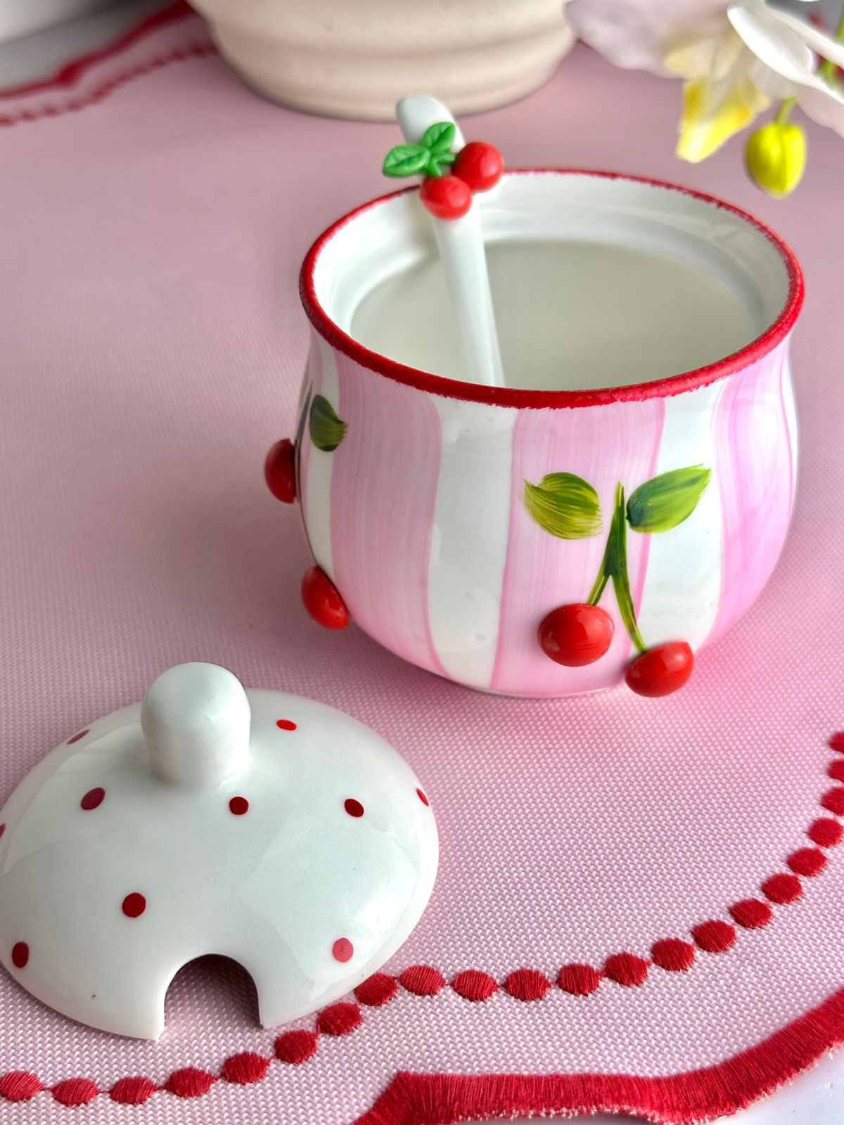 Detalhe das Cerejas:Pequenas duplas de cerejas pintadas à mão ou aplicadas em relevo sobre as listras. O contraste dovermelho vibranteda fruta com o verde oliva do cabinho sobre o fundo rosa cria um visual super charmoso e retrô.