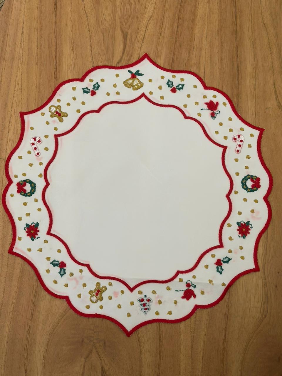 Jogo americano produzido em tela impermeável branca com bordado natalino.