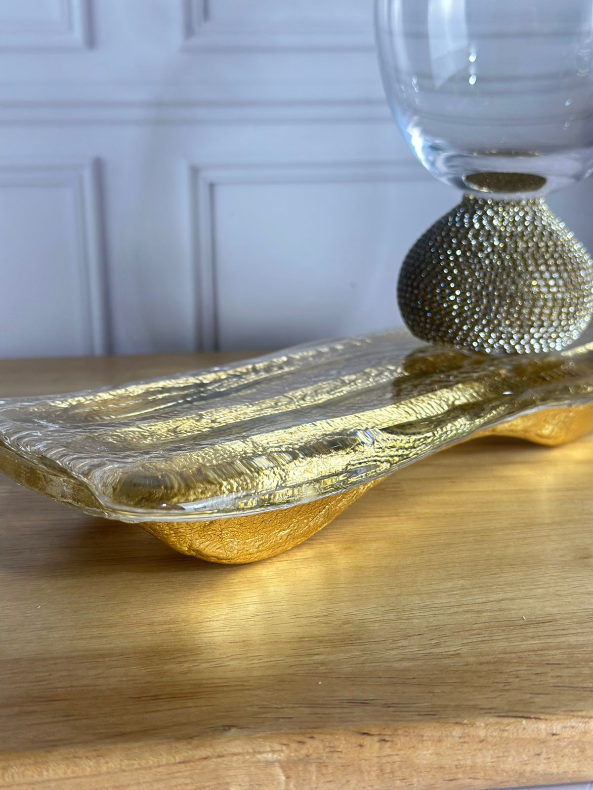 Umabandeja decorativa de vidro douradaé um item versátil que une sofisticação e funcionalidade, sendo ideal para organizar perfumes no lavabo, expor garrafas em um bar ou agrupar objetos na mesa de centro.