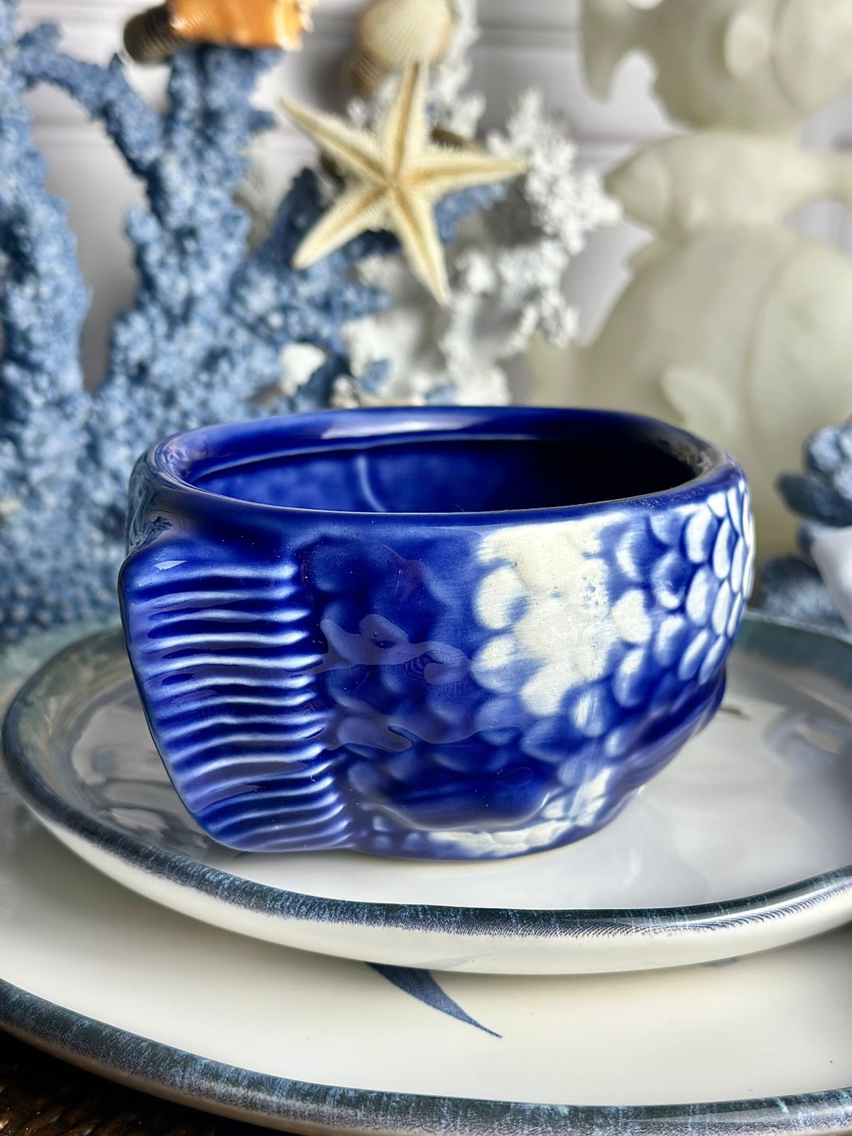 Produzido em cerâmica de alta qualidade, apresenta um design orgânico em forma de peixe, com acabamento rajado nas tonalidades azul e off white, criando um contraste visual que remete às profundezas oceânicas e às espumas das ondas. Sua forma assimétrica e fluida proporciona charme e movimento à composição da mesa.