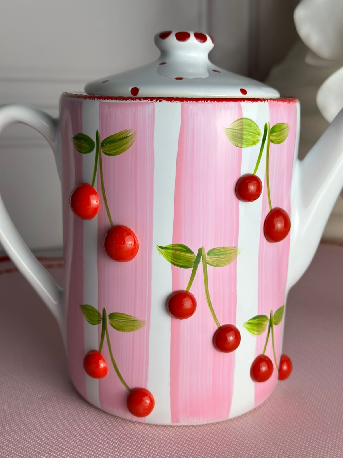 Um bule artesanal com estampa de cereja e listras rosa é uma peça que combina o charme do estilo vintage com a delicadeza do trabalho manual em cerâmica. Apresenta um design lúdico, sendo muito procurado para compor mesas de café da manhã ou "cantinhos do café" com uma estética romântica e acolhedora.