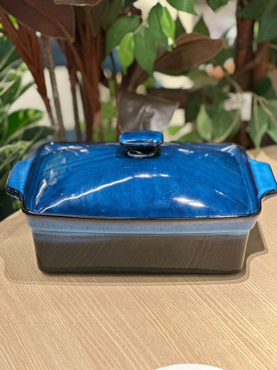 Design moderno e refinado em cerâmica azul Base de madeira estável para apresentação charmosa Ideal para jantares, festas e ocasiões especiais Transforme sua mesa e impressione seus convidados com estilo elegante