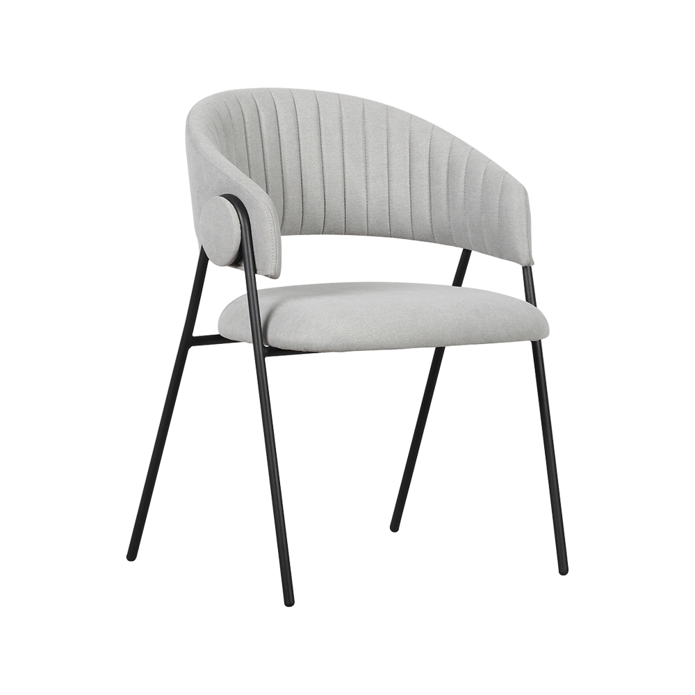 Cadeira com braços, com assento estofado em poliuretano ou tecido e base em aço pintado à pó.