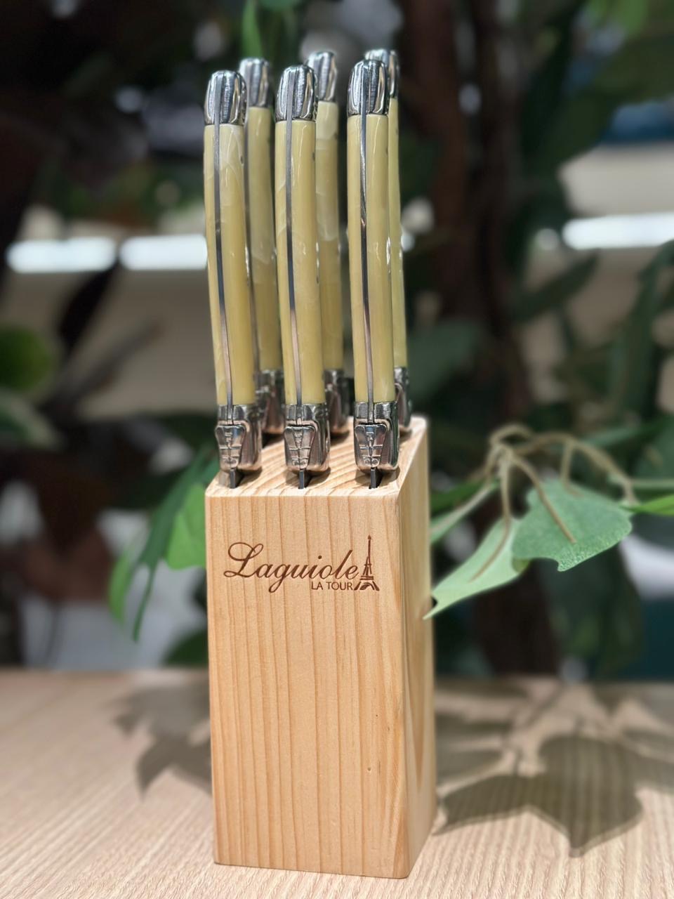 • Seis facas que vem num elegantíssimo cepo de madeira que facará lindo no seu Buffet