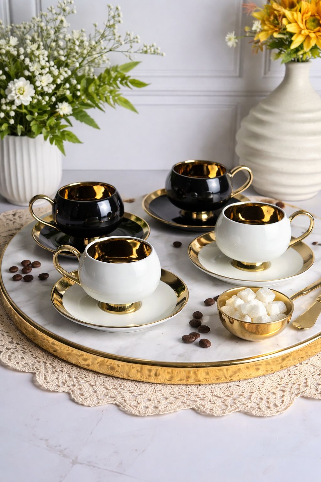 Este elegante conjunto de 4 xícaras com pires é ideal para quem busca sofisticação. Com um design clássico nas cores preto e branco, o destaque fica por conta do interior dourado, que traz um toque de luxo à mesa. Com capacidade para 200 ml, essas xícaras são perfeitas para compor um cantinho do chá e encantar seus convidados com estilo e bom gosto. Itens inclusos: 2 xícaras com pires na cor branca e 2 xícaras com pires na cor preta