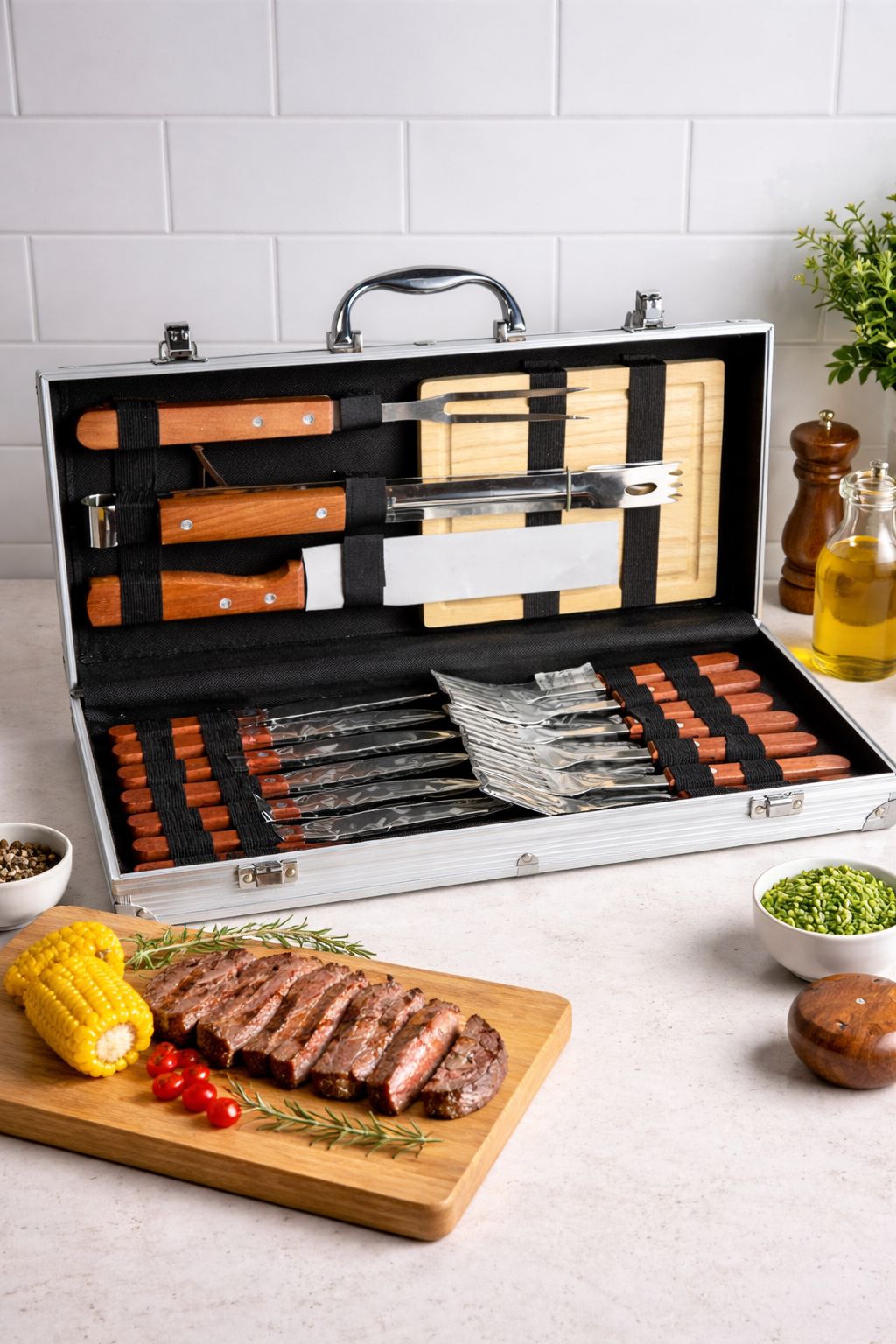 Se você leva o churrasco a sério, este Kit Profissional Fracalanza com 17 peças foi feito para você. Projetado para churrasqueiros exigentes, ele une beleza, precisão e praticidade em uma maleta resistente de alumínio, que exibe elegância e organização impecáveis. Aço inox de alta resistência, cabos de madeira natural e acabamento premium garantem uma experiência à altura dos melhores assadores do Brasil.
