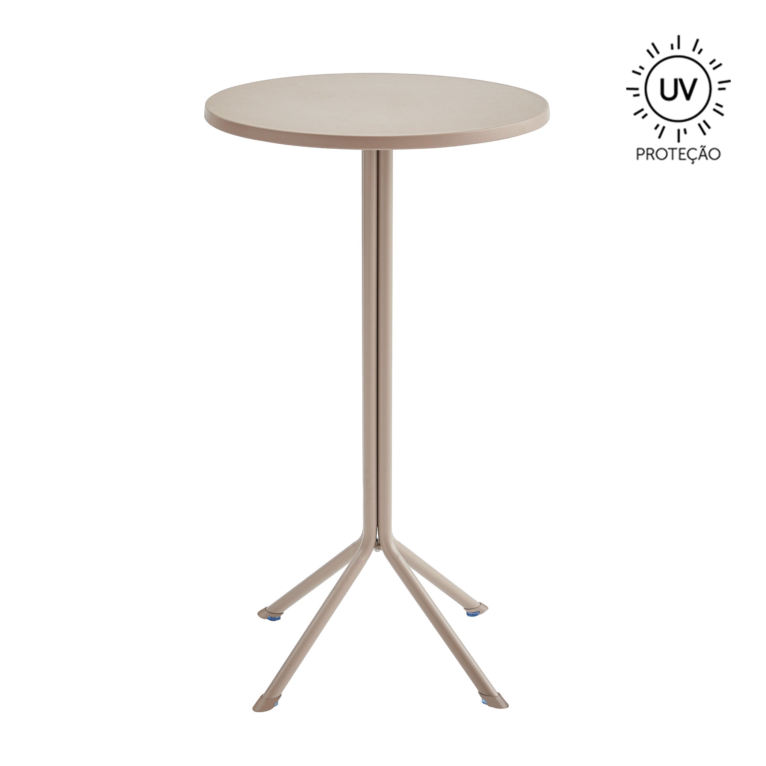 Mesa bistrô de polipropileno e base em aço pintada à pó. Possui proteção UV.