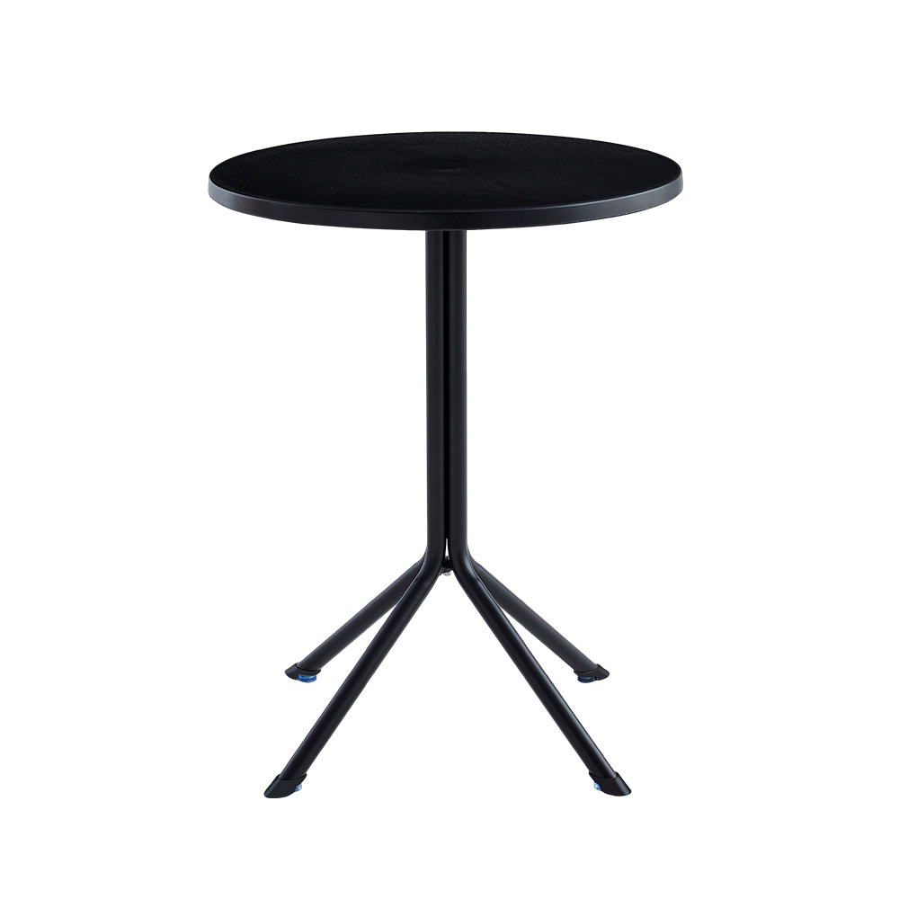 Mesa redonda de polipropileno e base em aço pintada à pó. Possui proteção UV.