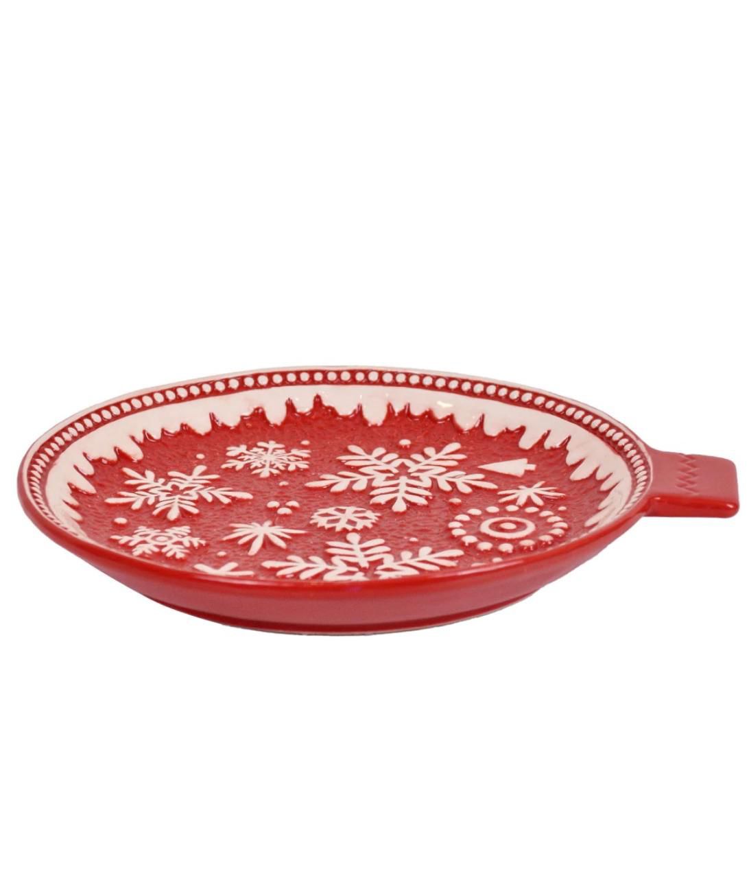 Cor e Estampa de Inverno: O interior do prato é esmaltado em vermelho intenso (vermelho festivo), com a superfície decorada com um intrincado padrão em relevo branco. A estampa é composta por floquinhos de neve, estrelas e designs circulares, simulando um desenho feito com glacê ou um bordado de inverno.