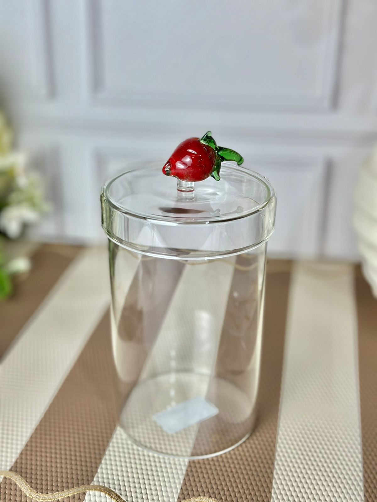 Pote em vidro borossilicato transparente, possui tampa com pegador em vidro em formato de morango. Com capacidade para 750 ml, e é ideal para armazenar biscoitos ou outros alimentos, ou usar de forma decorativa na cozinha.