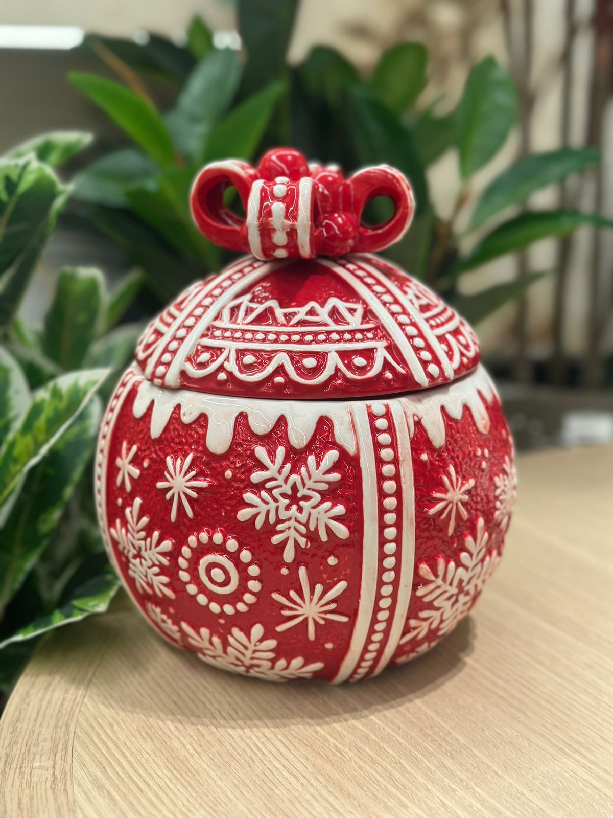 Produzido em cerâmica de alta qualidade, o potiche conta com tampa removível e acabamento brilhante, garantindo durabilidade e sofisticação. Pode ser usado como peça decorativa ou para armazenar pequenos objetos, doces e lembranças natalinas, tornando-se um item prático e encantador para composições temáticas.