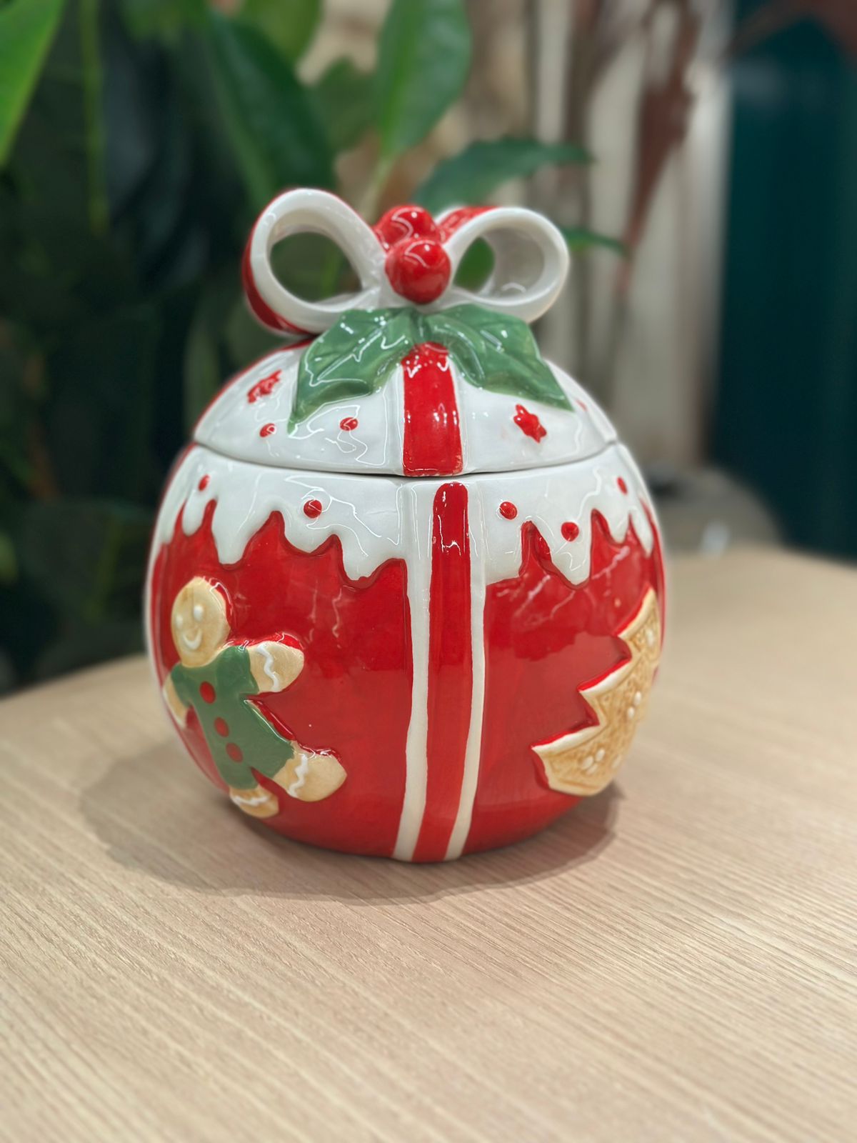 Tema Principal: Gingerbread: O pote é decorado no tema Gingerbread (bonecos e casinhas de biscoito de gengibre), que é frequentemente associado a guloseimas açucaradas e ao aconchego do Natal. Os detalhes são coloridos, imitando a cobertura e os confeitos dos biscoitos.
