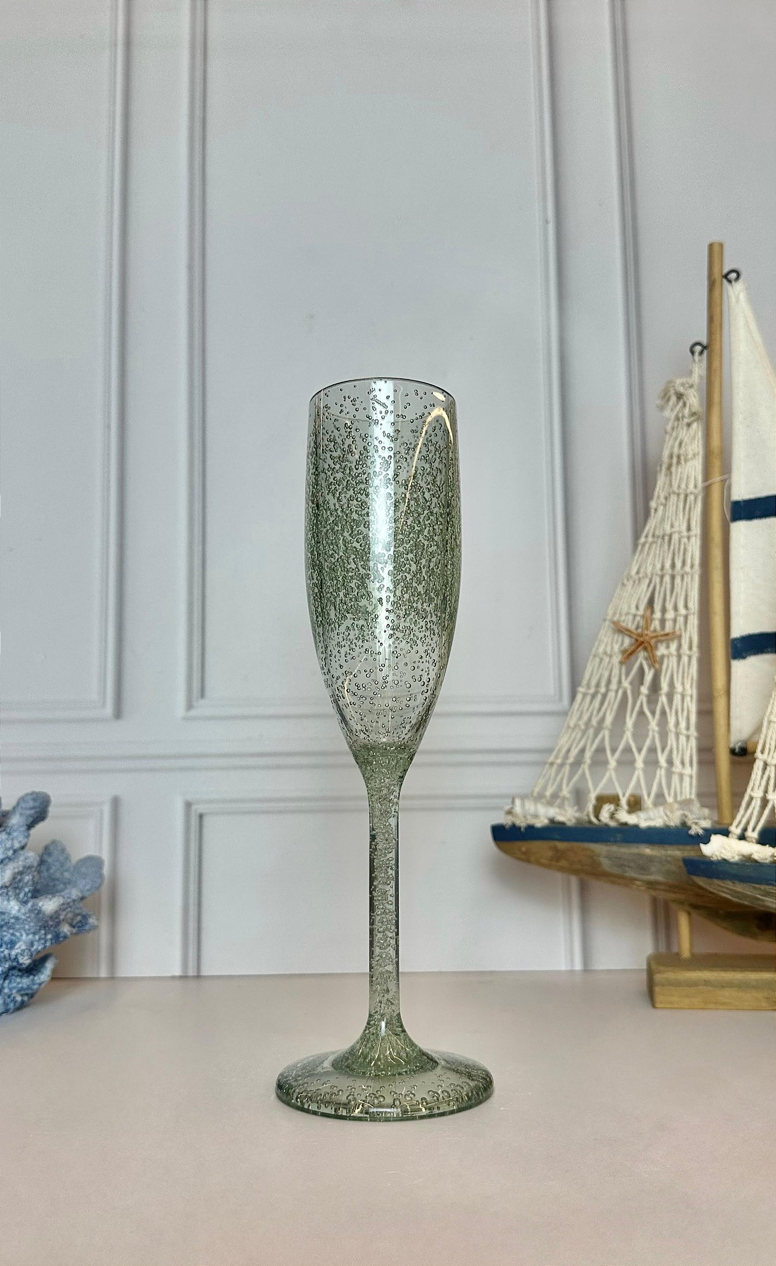A Taça para Champanhe em Acrílico com Detalhes Bolhas Verde 296ml é perfeita para servir com segurança evitando o risco de quebra.