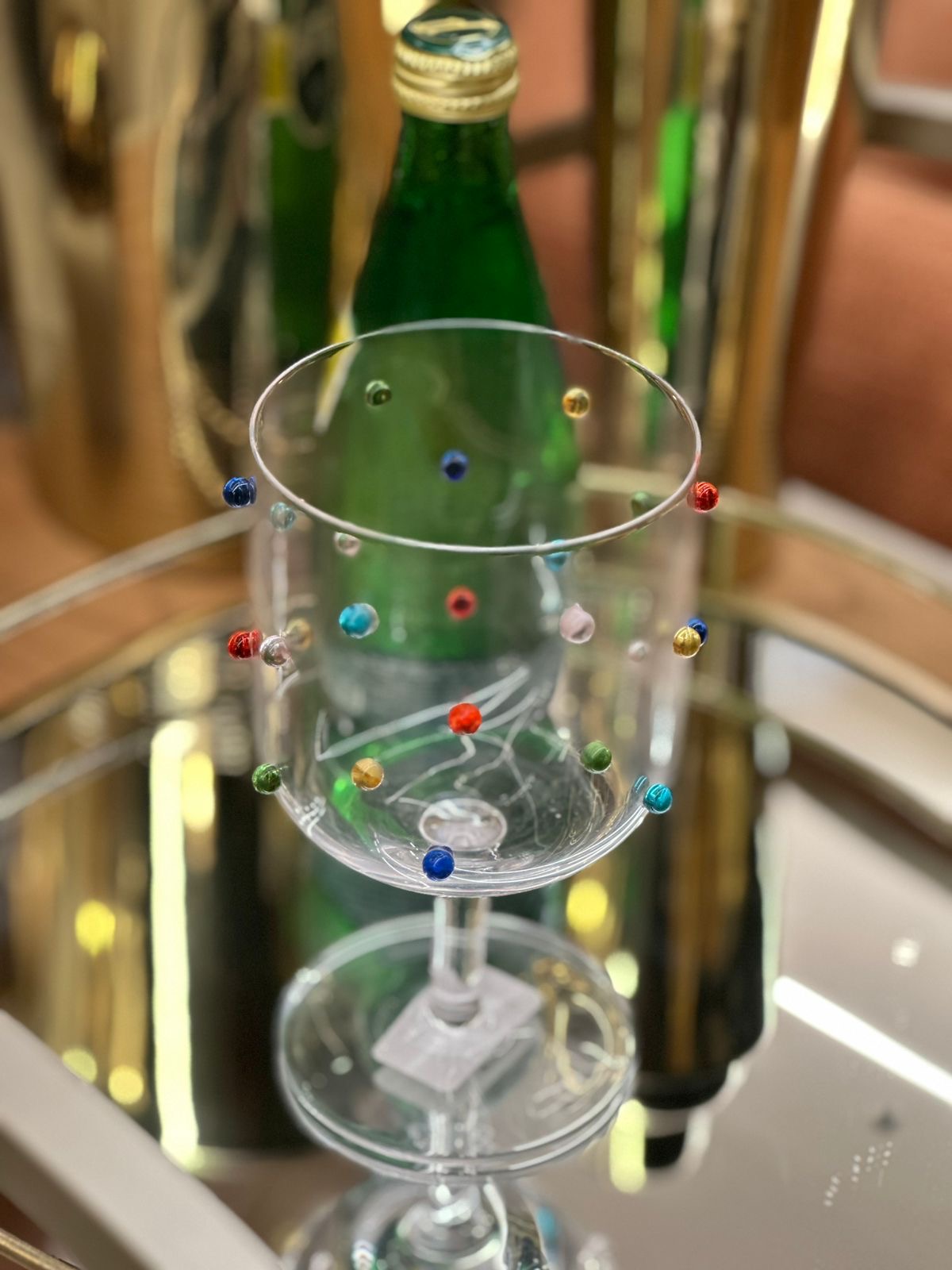 Toda em vidro incolor com bolinhas, também em vidro coloridas, elas vão chamar a atenção de todos! ótima opção para servir água, suco e refrigerantes ou ate mesmo drinks, elas se destacam em sua mesa posta ou até em uma bandeja para decorar seu ambiente com design diferente e criativo!