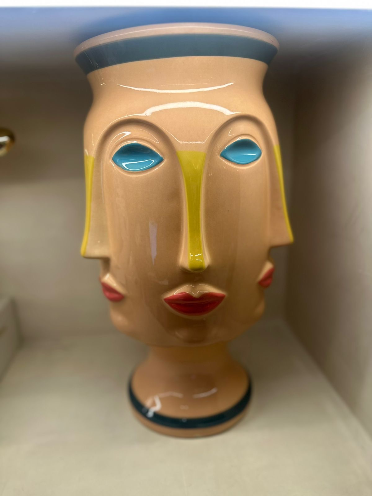 A paleta de cores sofisticada, com um tom de bege-rosado como base, é elegantemente complementada por detalhes em amarelo-claro, azul-celeste e um rosa-coral nos lábios. A base e a boca do vaso, com faixas em um tom de verde-escuro, emolduram a peça e conferem um acabamento refinado. Perfeito para quem aprecia design com alma, este vaso é uma escultura que também pode abrigar seus mais belos arranjos florais.