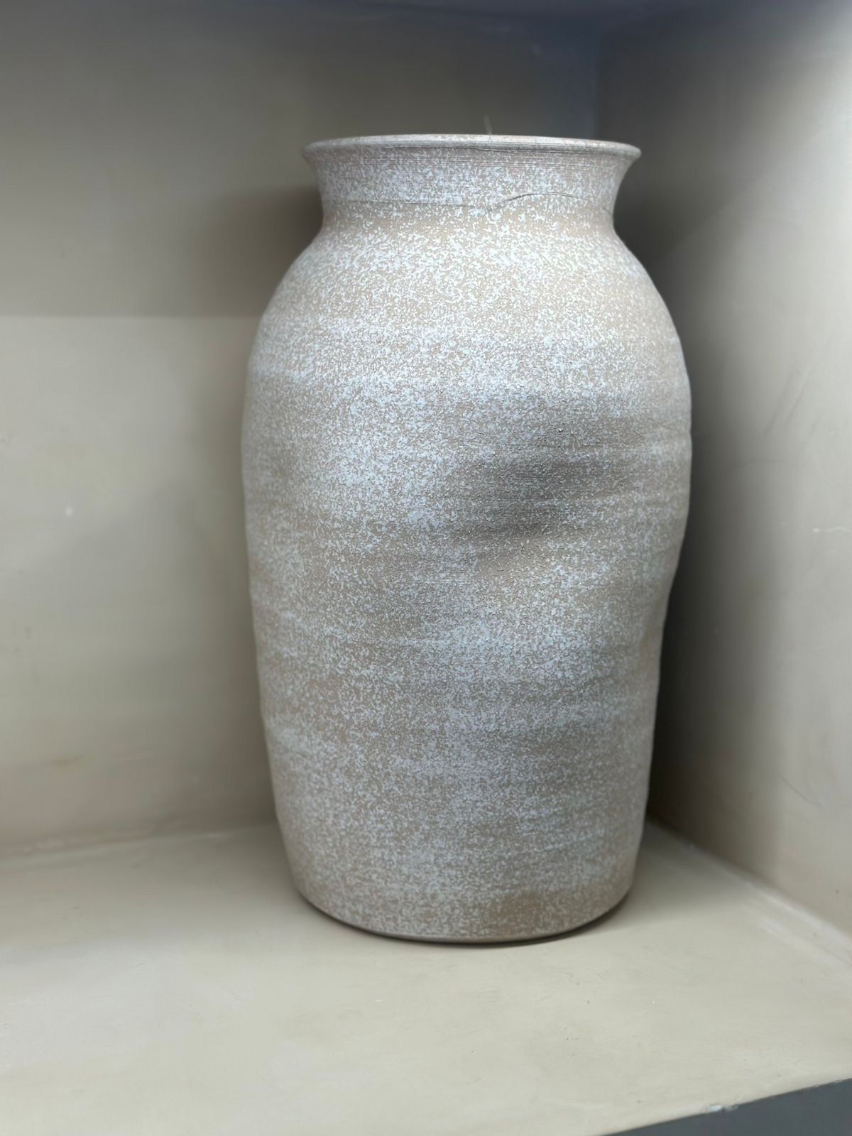 Vaso Decorativo em Ceramica, com alto relevo, com uma leve textura em areia com acabamento em pátina nas cores bege e branco.
