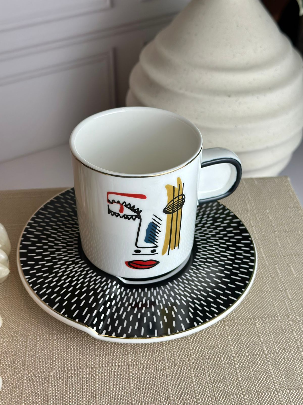 Elevando o charme das suas pausas para o chá, a Xícaras Faces oferece um toque de elegância e sofisticação. Fabricada em porcelana New Bone de alta qualidade, cada xícara vem acompanhada de um pires, ambos adornados com uma borda dourada que enriquece a sua mesa com um detalhe requintado.