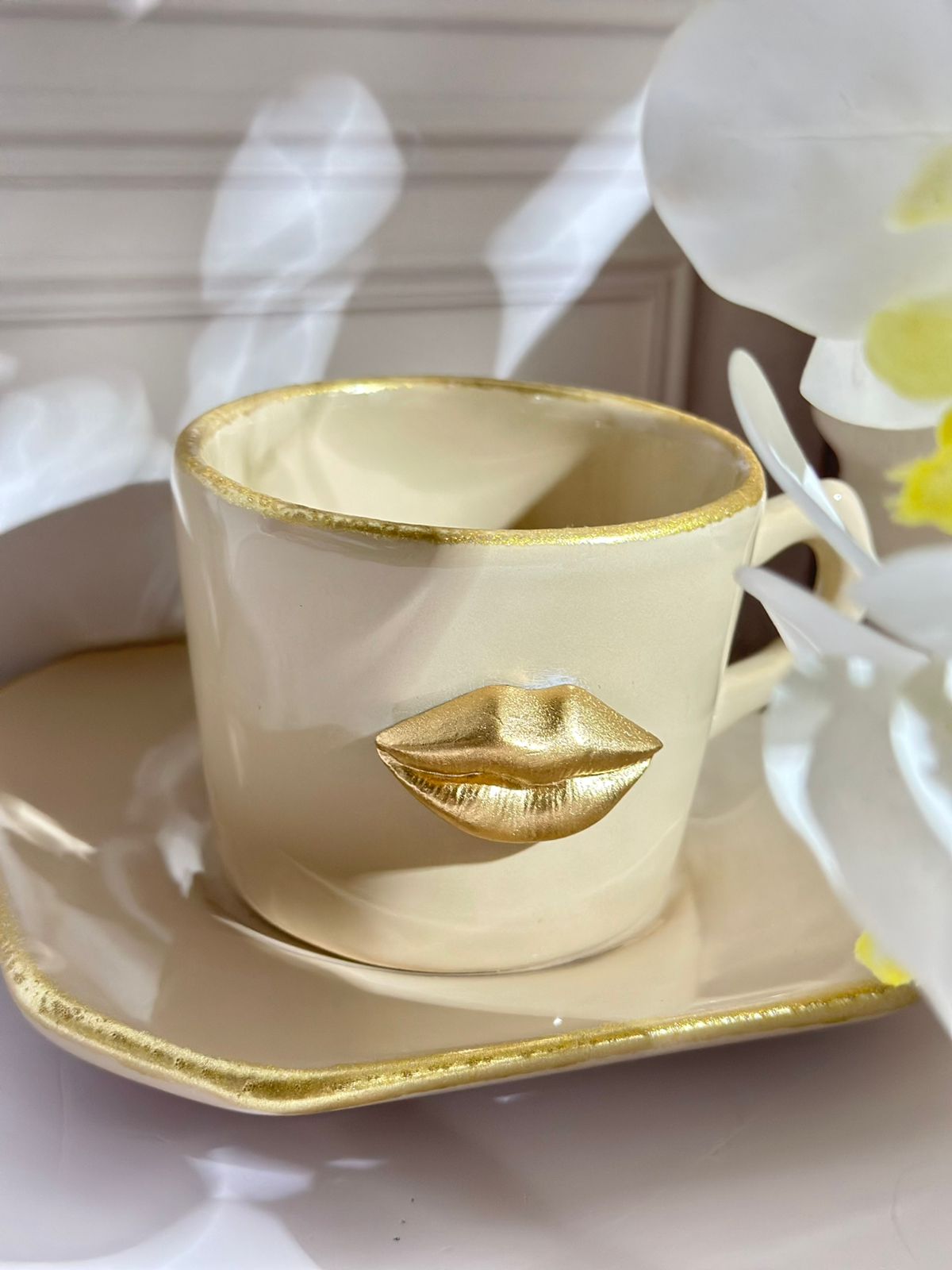 Xícara com pires artesanal bege boca dourada
