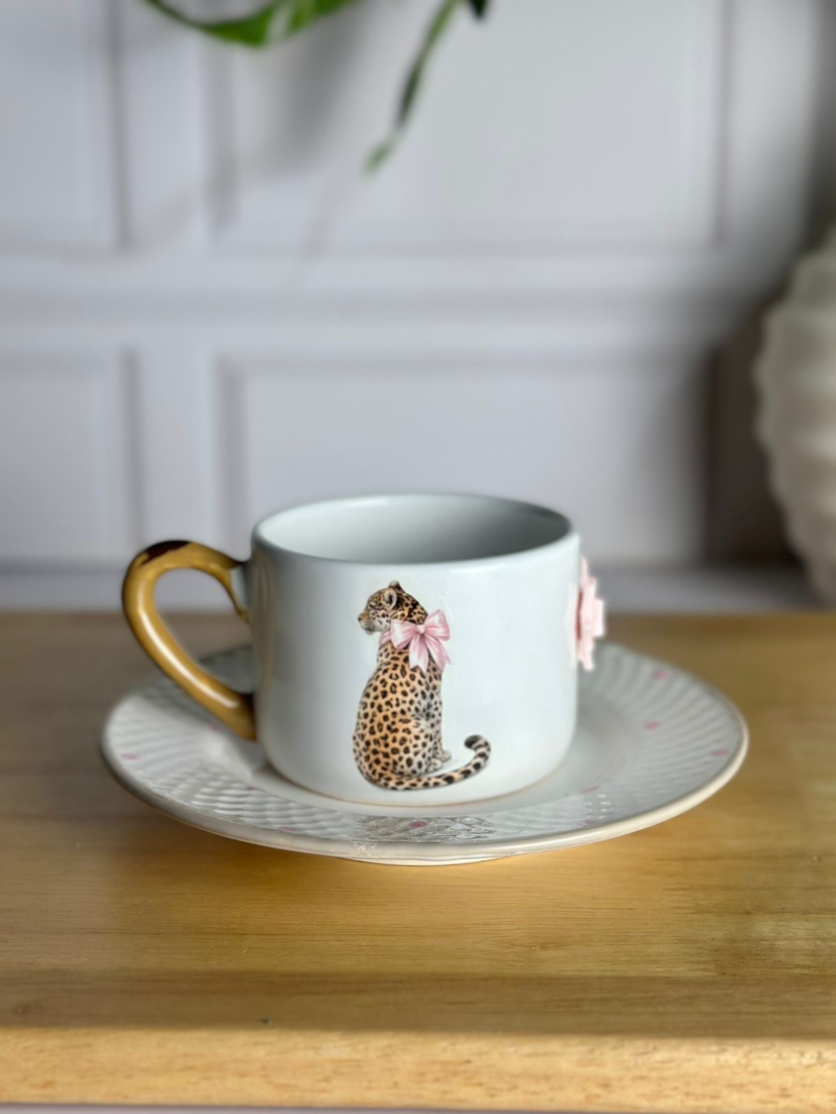Leve o charme do animal print para a sua mesa posta com esta peça exclusiva e inteiramente artesanal. Esta xícara une a personalidade da estampa de onça pintada com a delicadeza romântica de um laço rosa aplicado em alto relevo, criando um contraste moderno e sofisticado. Cada detalhe é moldado à mão, garantindo que sua peça seja única. O pires acompanha o design, proporcionando uma experiência de café ou chá cheia de estilo e elegância.